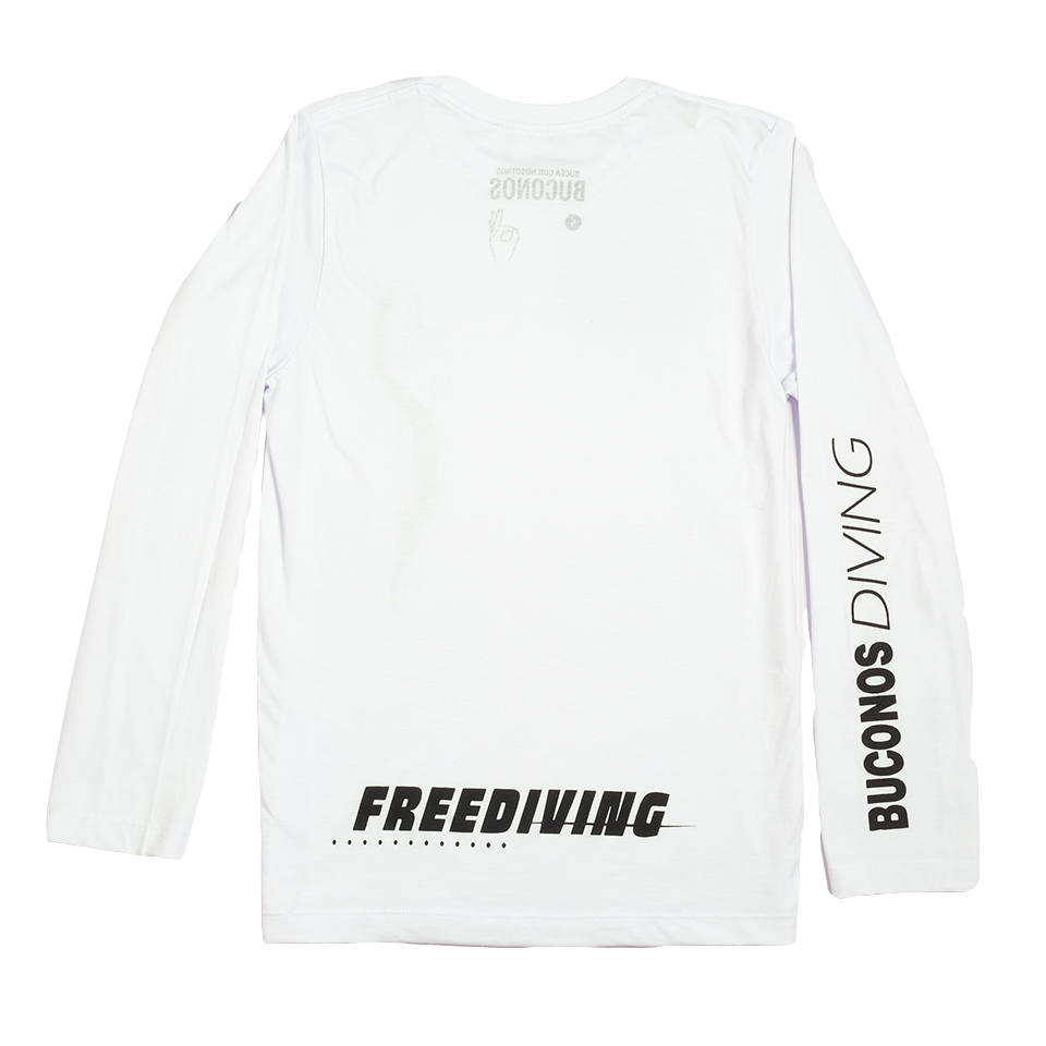 Camiseta manga larga UNISEX 100% algodón Hecho en Colombia Detalles: Logo YogApnea (Programa de entrenamiento Buconos) Logo Molchanovs (Buconos es una escuela autorizada para la promoción de la marca) Medidas de tallas: en centímetros LARGO (pecho de axila a otra) x ANCHO (hombro hasta base) S: 48 x 68cm M: 51 x 71cm L: 56 x 64cm